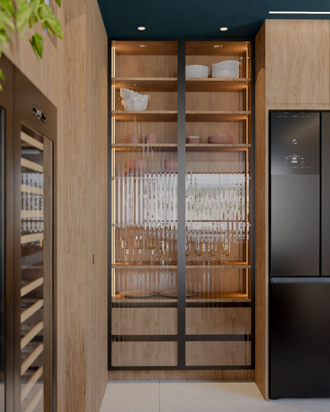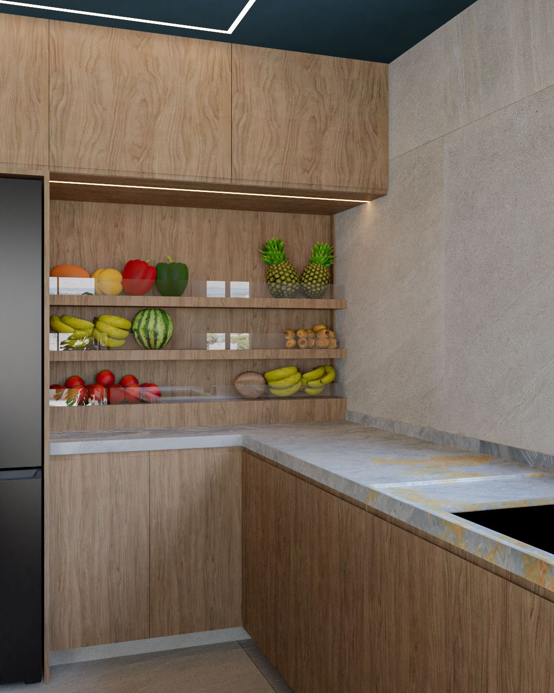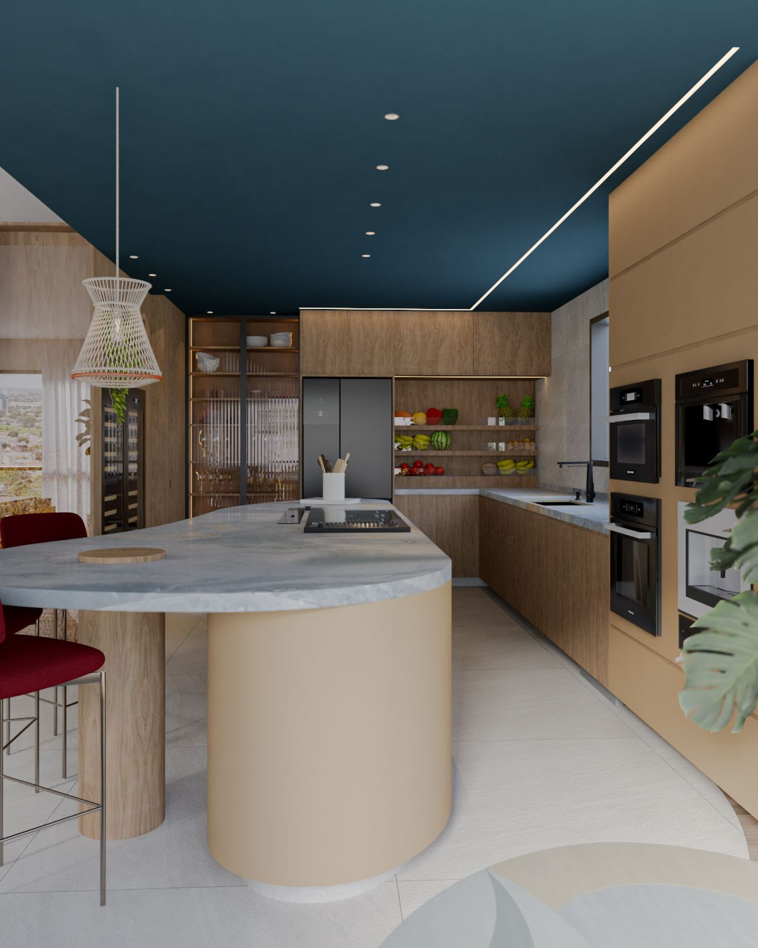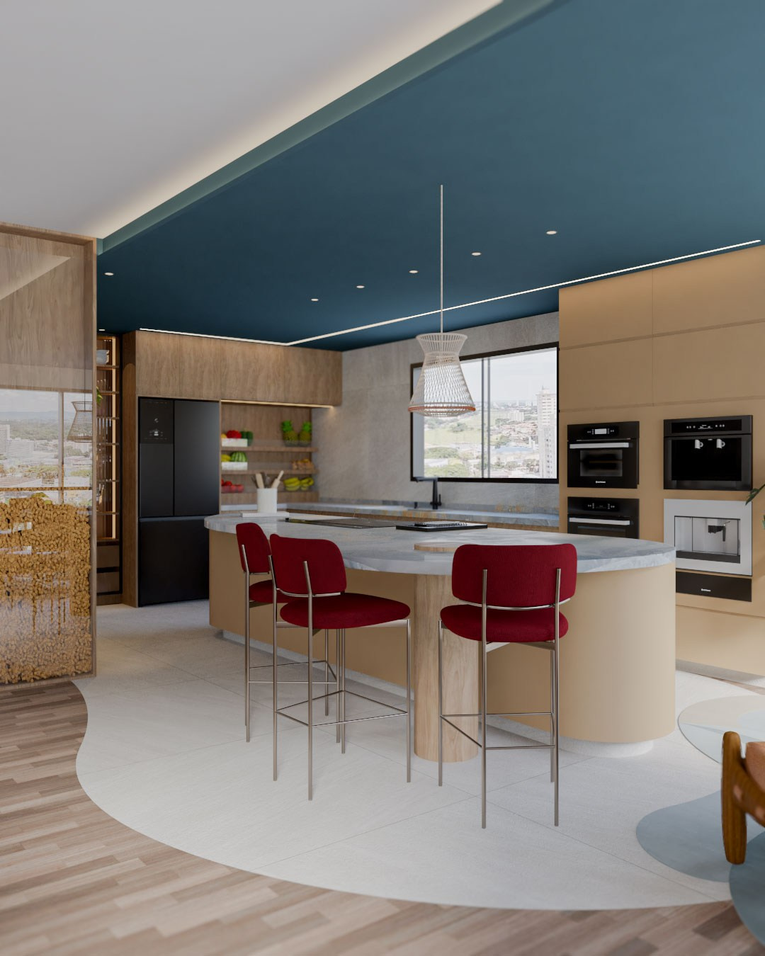 Durante nosso Brieting o Léo comentou que em um determinado momento houve uma dúvida sobre os armários da cozinha serem amarelos ou azuis, afinal são cores que eles dois são apaixonados, mas optaram pelo amarelo no final das contas. Claro que essa informação não passaria batida por nós, então trouxemos as duas cores, em extremidades da cozinha: no armário e no teto