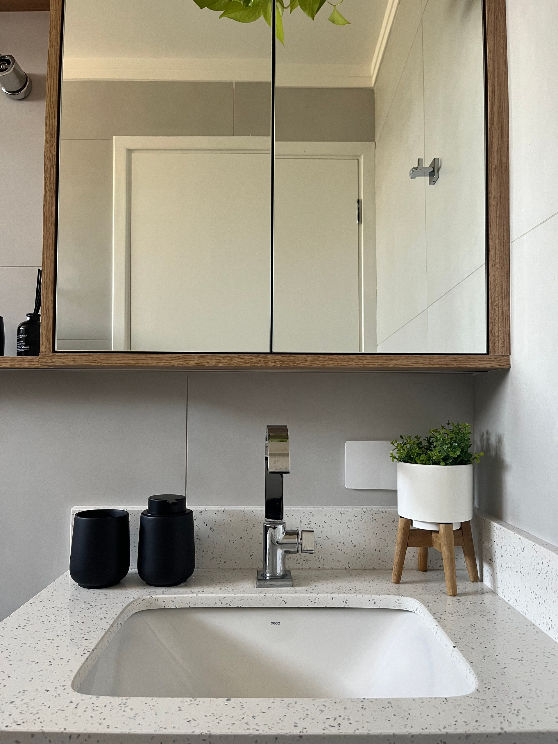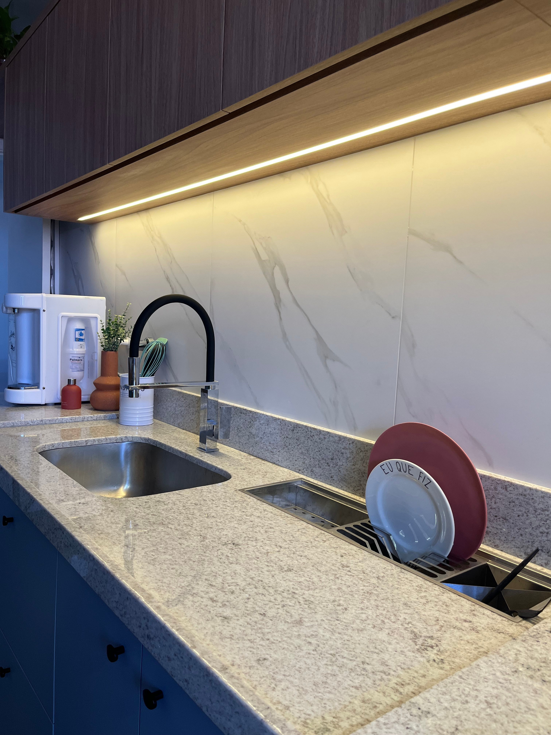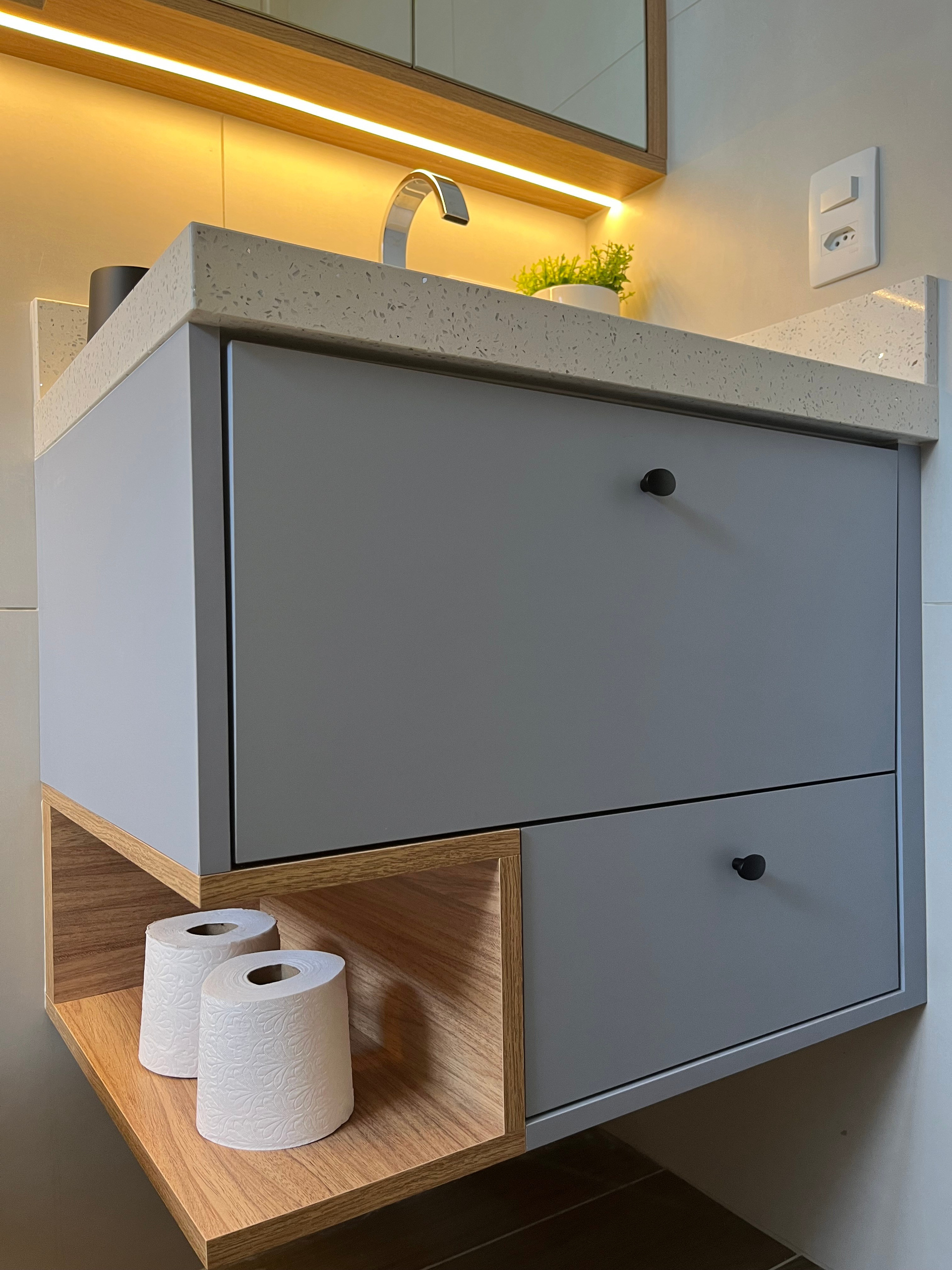 Dona Lair e Senhor Milton nos procuraram após um acidente doméstico causado por uma escolha errada de revestimento. A ideia inicial seria apenas trocar os acabamentos para opções seguras e que combinassem com a estética do resto da casa, mas eles foram além: pediram uma intervenção criativa que eles não iriam esperar!