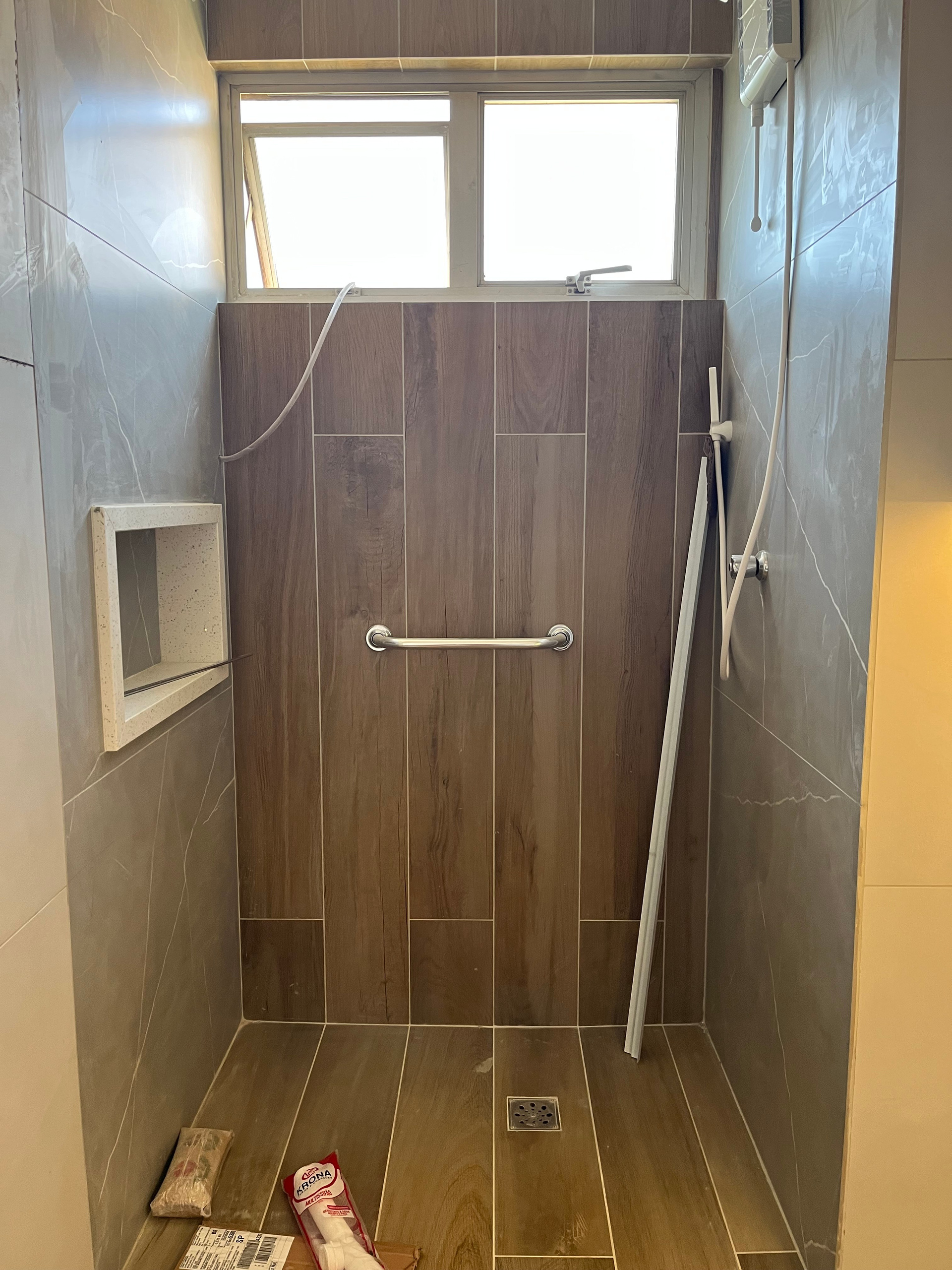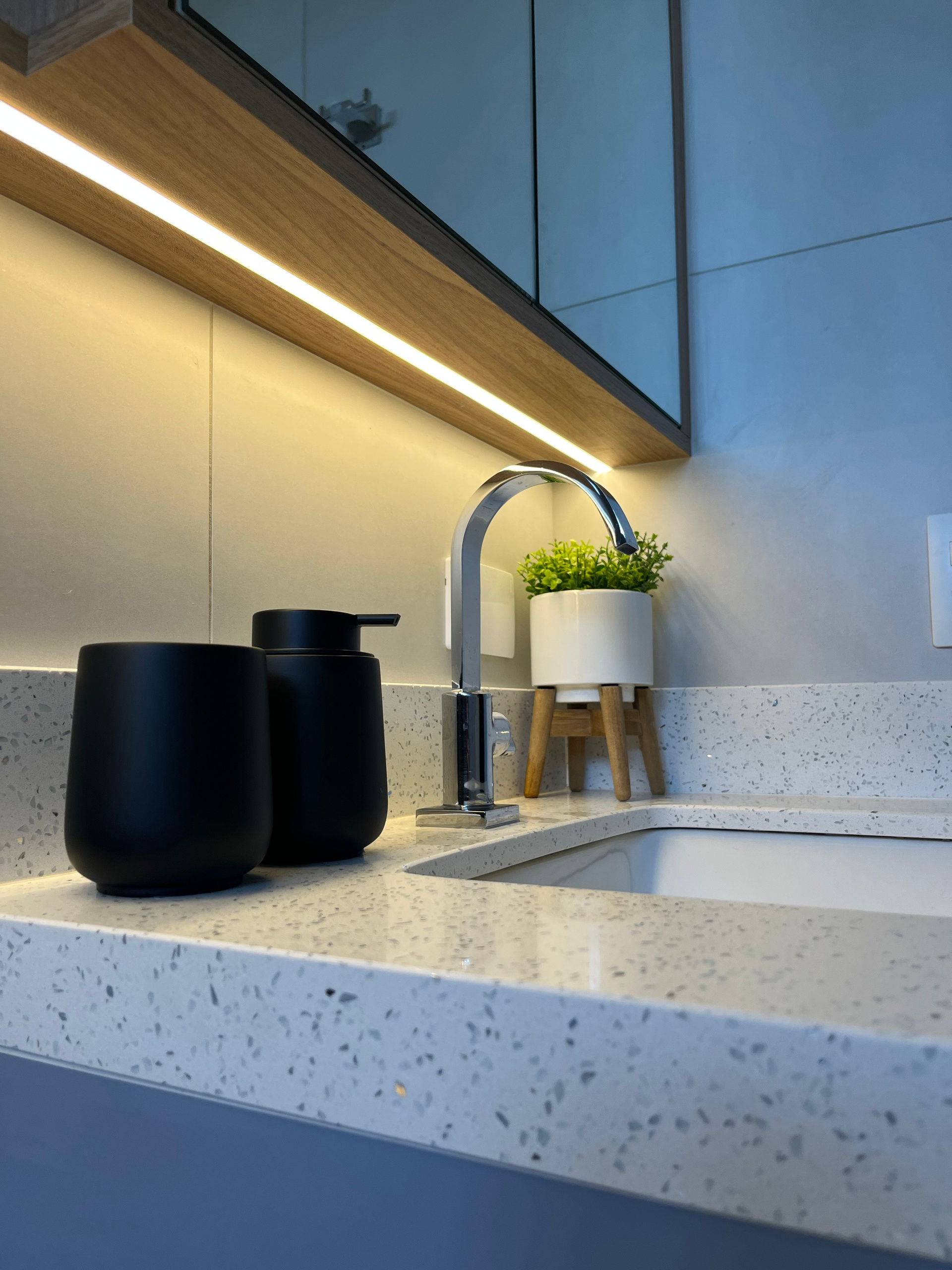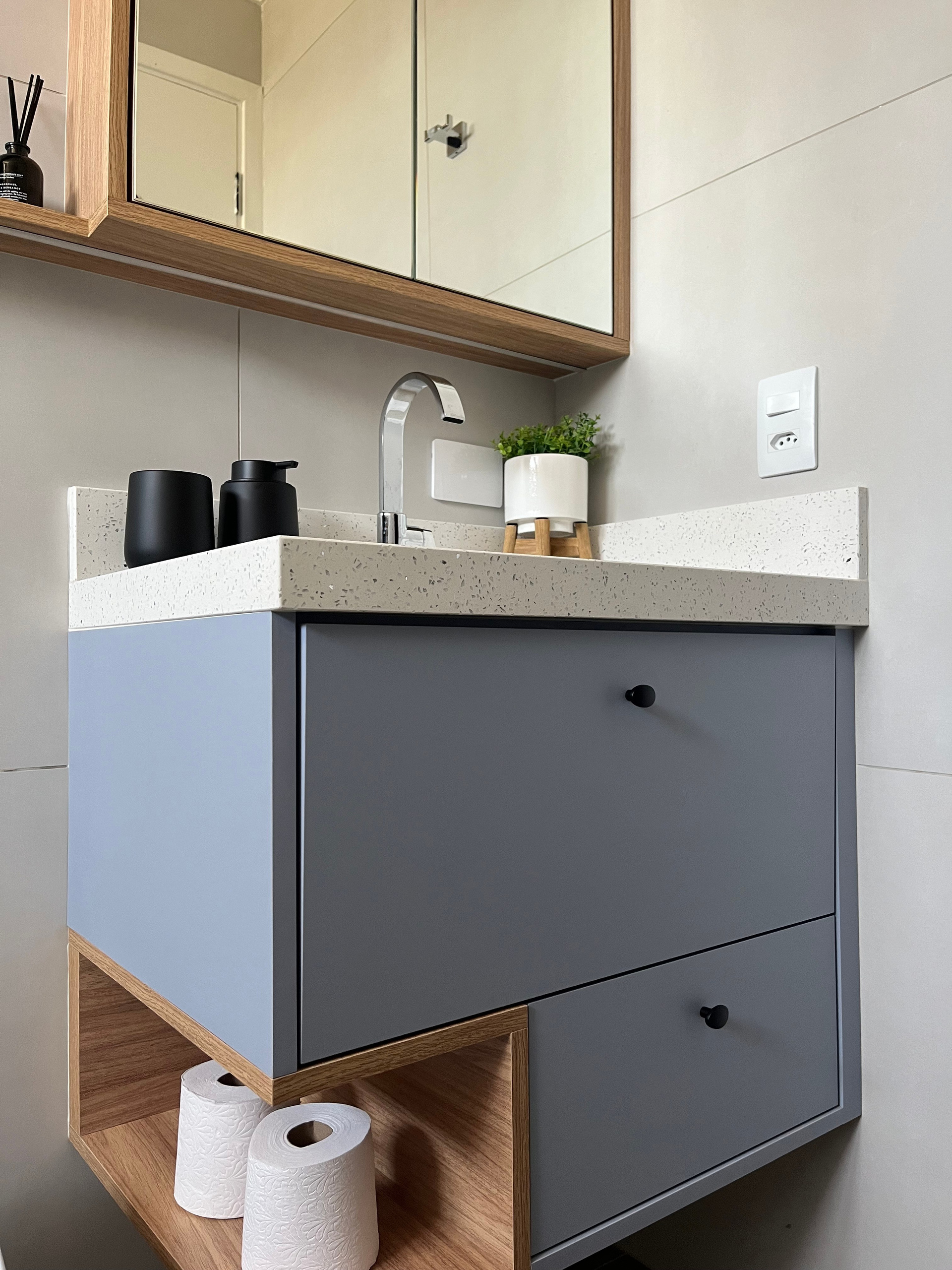 Dona Lair e Senhor Milton nos procuraram após um acidente doméstico causado por uma escolha errada de revestimento. A ideia inicial seria apenas trocar os acabamentos para opções seguras e que combinassem com a estética do resto da casa, mas eles foram além: pediram uma intervenção criativa que eles não iriam esperar!