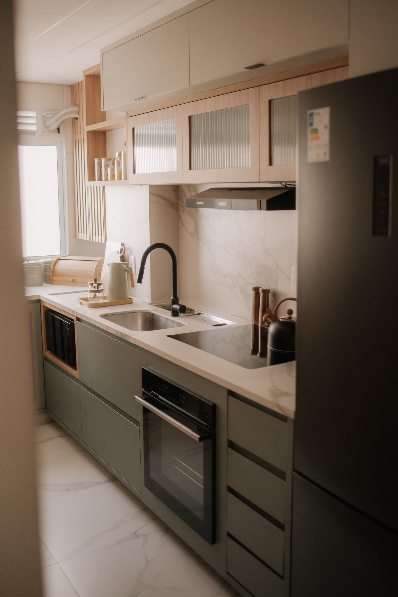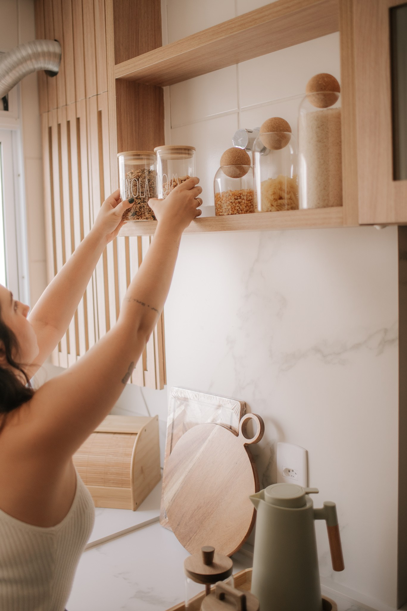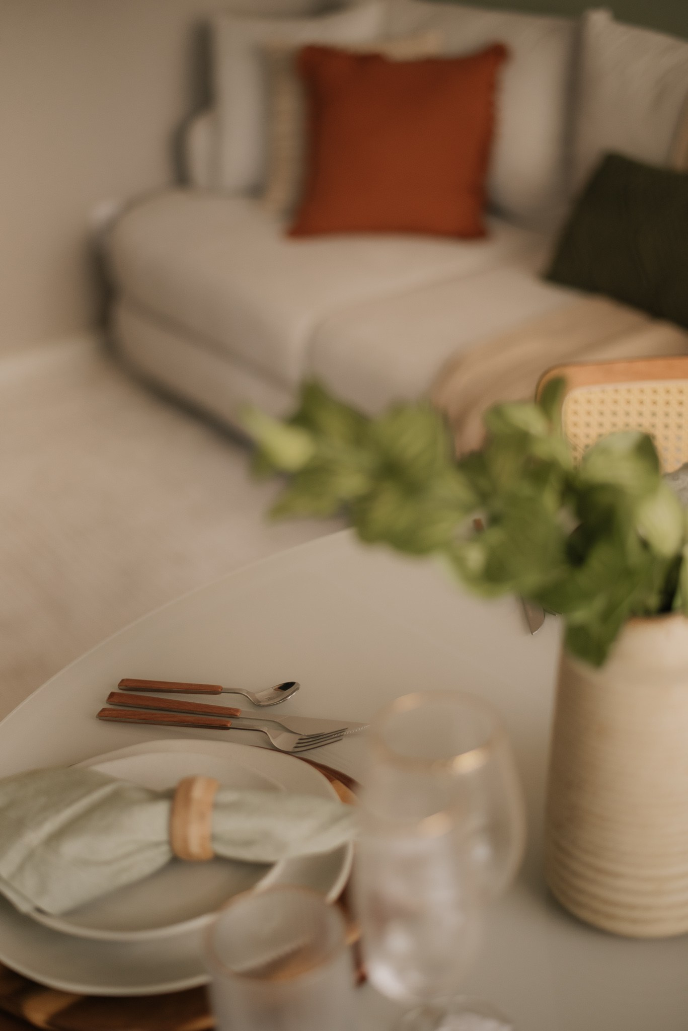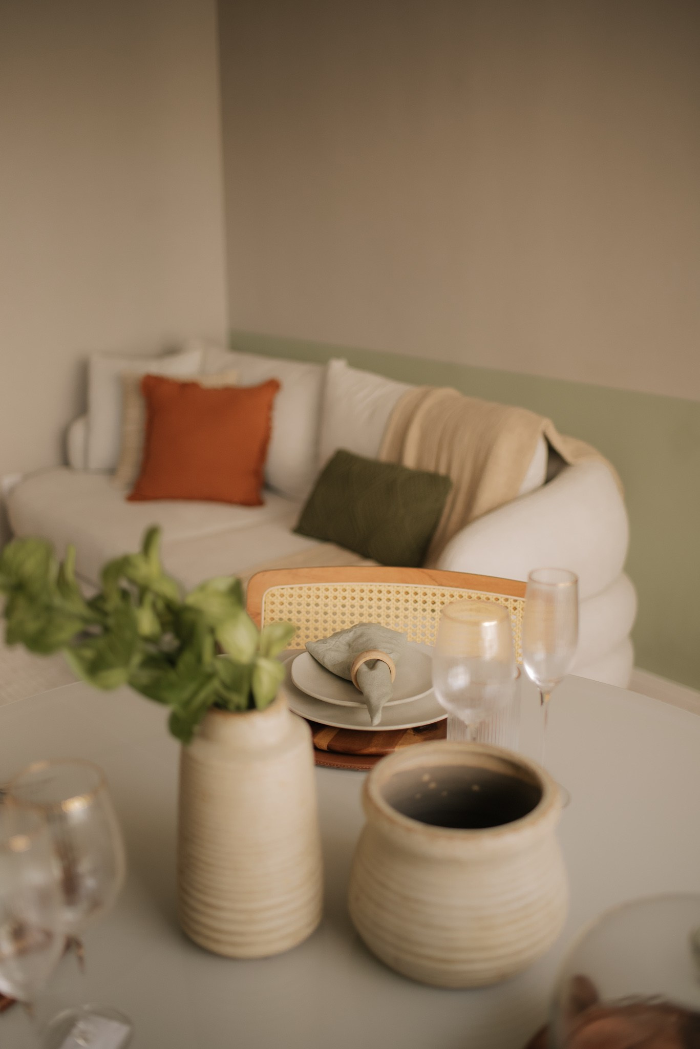 Evitamos trocas de revestimentos e barateamos o processo com escolhas estratégicas. Antes de entregar a obra, decoramos todo o espaço com utensílios da Loja Camicado para que nossos clientes entrassem e sentissem o espaço 100% pronto, com mesa posta e uma cozinha repleta e convidativa para um jantar em casa.